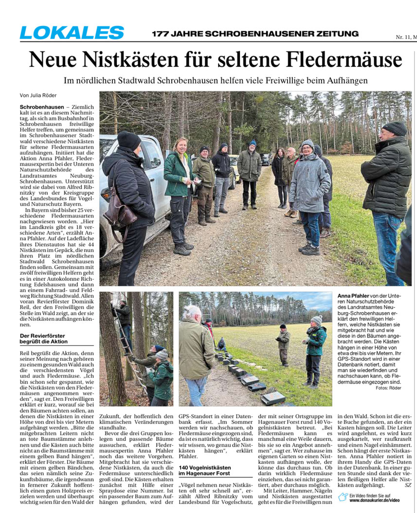 Bei unserer ersten gemeinsamen Aktion haben wir in einem Waldstück zwischen Karlshuld und Neuburg (Rödenhof) eine größere Anzahl von Flachkästen für Fledermäuse aufgehängt. Möglich wurde diese Aktion durch das große Engagement von Anna Pfahler von der UNB Neuburg, die die Nistkästen beschafft hat und auch die Absprachen mit dem Revierförster getroffen hat. Trotz frostiger Temperaturen hatte sich eine ansehnliche Gruppe an Fledermausbegeisterten eingefunden, so dass wir sehr zügig arbeiten konnten. In dem leider sehr stark durchforsteten Waldstück konnten wir die Kästen an die dortigen Biotopbäume anbringen. Bei diesen ökologisch besonders wertvollen Bäumen ist auch in den nächsten Jahren gewährleistet, dass diese nicht entnommen werden. Parallel zum Aufhängen der Nistkasten wurde diese mit Hilfe der Nistkasten-App des NABU digital erfasst. So wollen wir gewährleisten, dass die Daten über den Nistkastenbestand im Landkreis an einem zentralen Ort gesammelt werden und jederzeit eine Auswertung möglich ist.